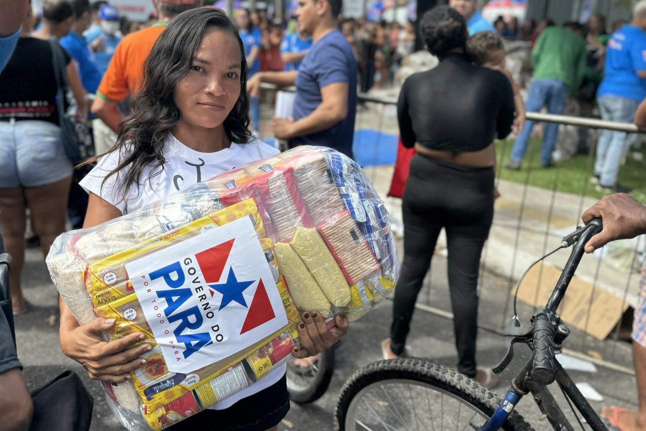 Desempregada e mãe de duas filhas, Aline Souza, de 35 anos, foi uma das beneficiárias das mais de mil cestas básicas entregues durante a ação de cidadania do "Governo do Pará nos Bairros", realizada no Paar, em Ananindeua, na Região Metropolitana de Belém. A entrega foi realizada na última quarta-feira (3), durante evento em comemoração aos 80 anos do município.