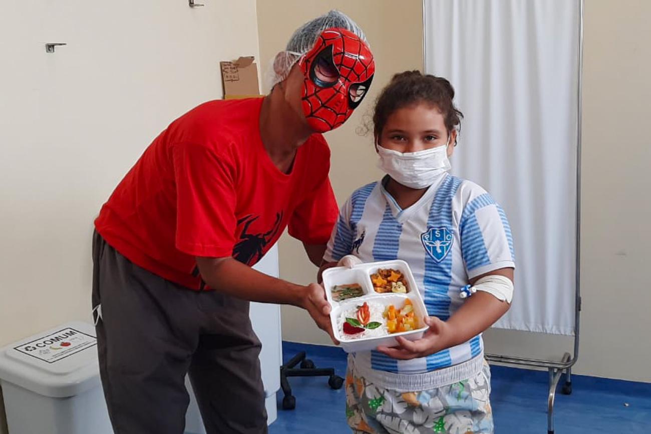 Foi o caso do pequeno Joaquim Cunha, de 1 ano e 3 meses, que foi atendido na urgência pediátrica no HRAS devido a um desconforto intestinal. Ao receber a comida no leito, entregue pelo personagem Homem-Aranha, a criança se alegrou, abriu um largo sorriso e ficou encantando com o desenho de urso feito com os alimentos.