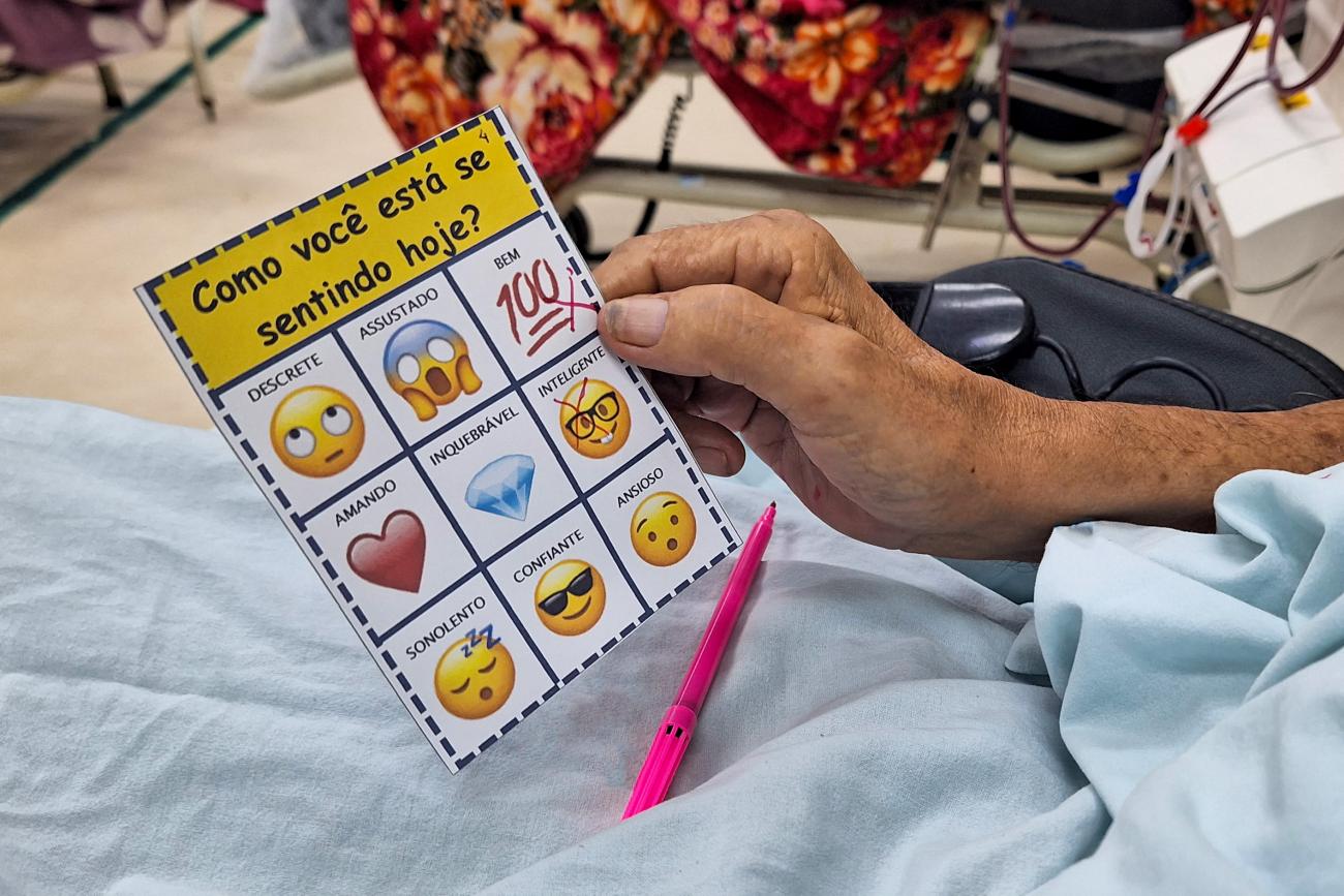 E na quinta-feira (25), ele e outros pacientes da hemodiálise tiveram a oportunidade de falar sobre como se sentem e cuidar um pouco mais da saúde mental. E tudo isso foi promovido de uma maneira muito especial, através de um “bingo das emoções”.