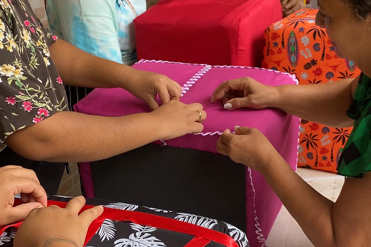 A podóloga Sandra Sales foi uma das participantes da oficina de puff. Para ela, o aprendizado foi uma oportunidade de desenvolver novas habilidades e poder gerar uma renda extra. “Estou com 61 anos, mas aqui nós temos mulheres de todas as idades que estão aprendendo novas técnicas e possibilidades de ganhar um dinheiro extra para suas casas”, conta Sandra.