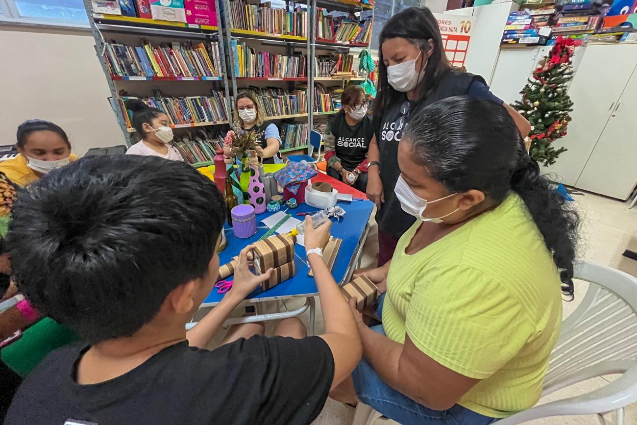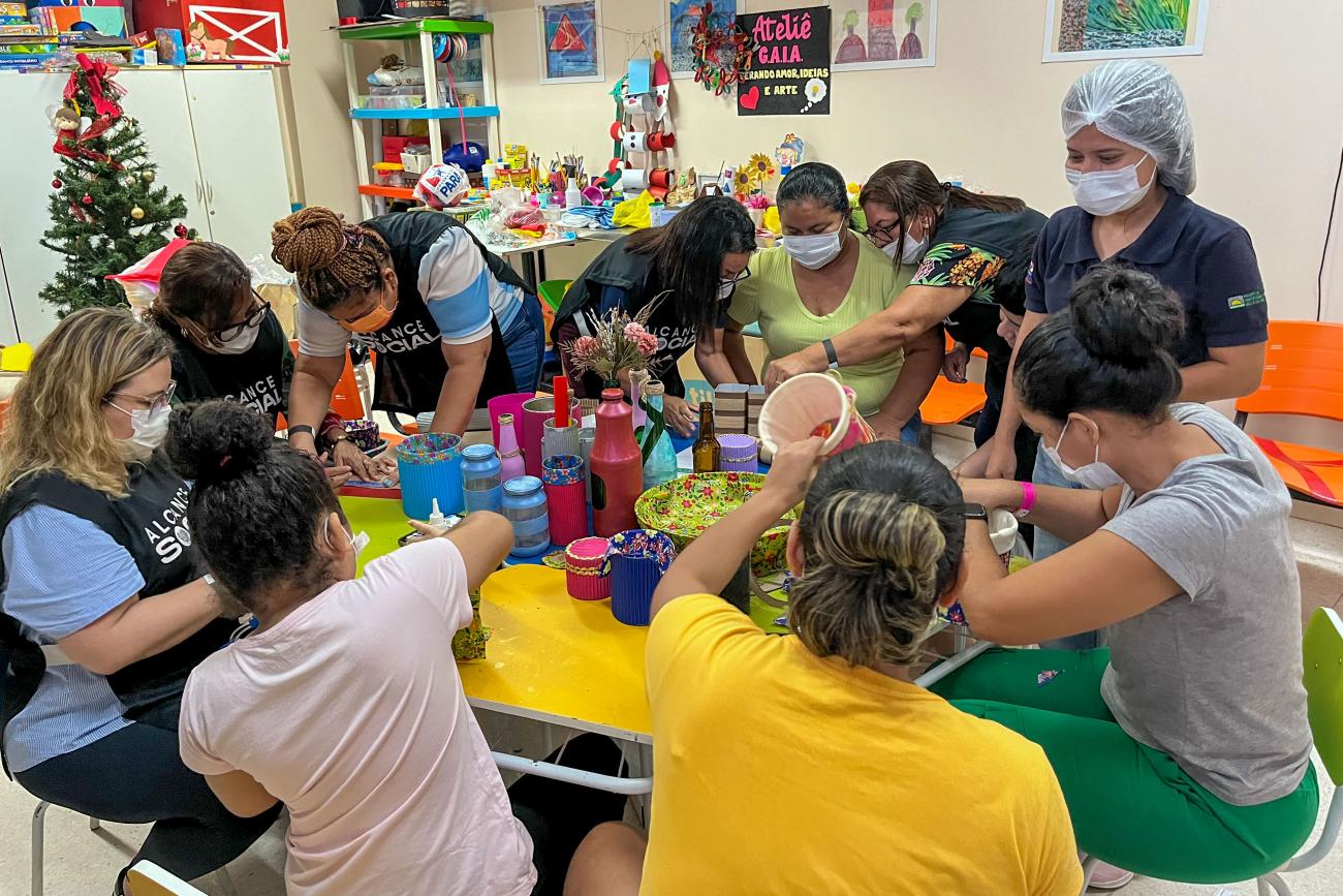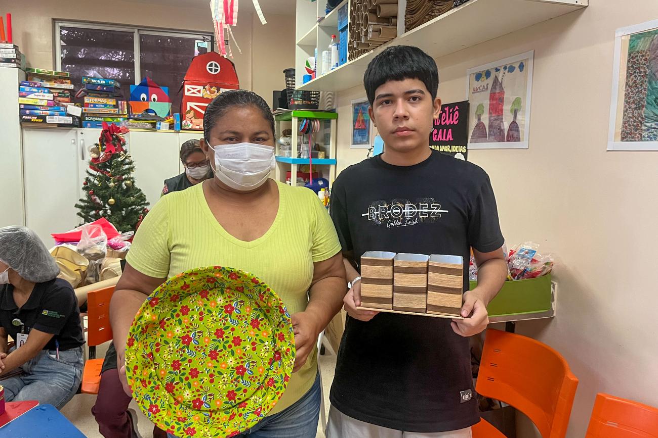 Apesar do mal-estar que sentiu antes da oficina, Adriana Silva, 41 anos, moradora da Vila dos Cabanos, localizada no município de Barcarena, fez questão de participar da atividade ao lado do filho Marcelo. "Meu filho estava estressado, então viemos nos distrair e aprender a fazer algo diferente e prazeroso. Juntos fizemos uma fruteira e um porta caneta, foi muito divertido", contou.