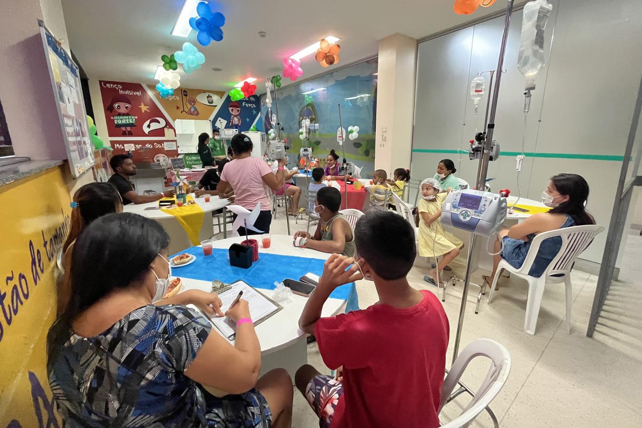 O pequeno Rodolfo Vinícius, 4 anos, internado há um mês no hospital para tratar um câncer, era só sorrisos com a novidade nas mãos e chegou a reclamar quando um pedaço caiu no chão. Há um mês internado mostrou satisfação ao comer o lanche. Ele veio do município de Marabá sob os cuidados da tia Márcia Souza, para receber atendimento especializado.