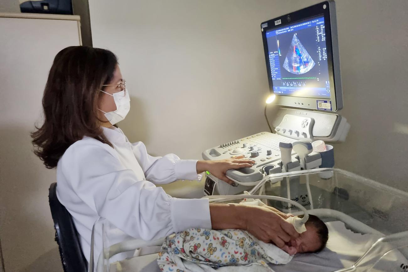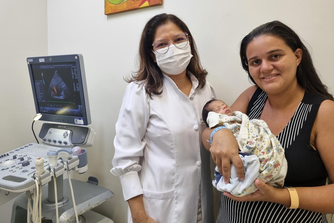 Cardiologista pediátrica realizando ecocardiogramaEssencial para o diagnóstico de cardiopatias congênitas (malformações cardíacas que se apresentam antes ou logo após o nascimento), o exame de oximetria de pulso, mais conhecido como teste do coraçãozinho, é realizado desde 2019 na Santa Casa, no intervalo que vai de 24 a 48 horas após o nascimento do bebê e obrigatoriamente antes da alta hospitalar.