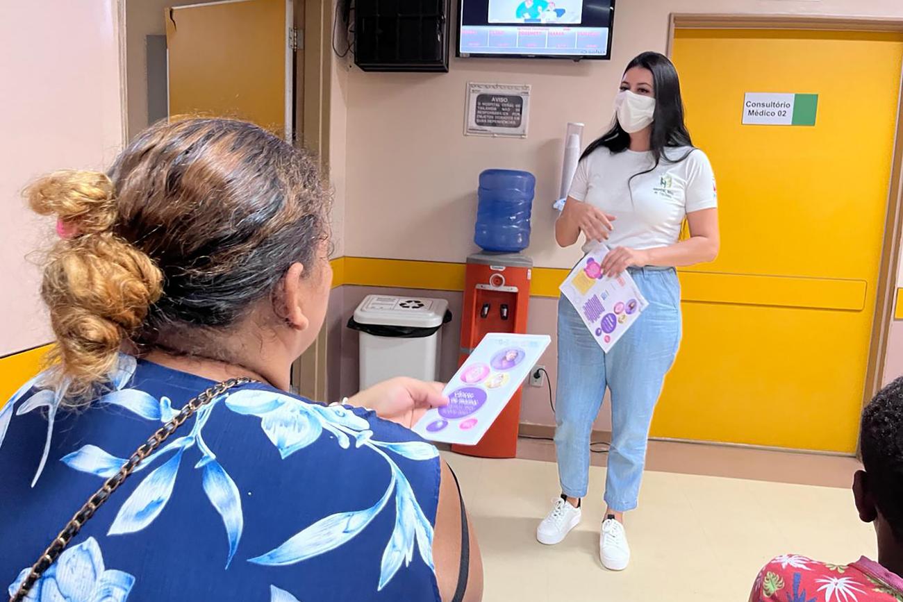 Educação - Com o objetivo de abordar temas relacionados à detecção precoce de alterações e ressaltar a eficácia da mamografia na prevenção do câncer de mama, o Grupo de Trabalho de Humanização (GTH) da unidade promoveu uma ação de educação em saúde direcionada aos pacientes que aguardavam atendimento ambulatorial. Foram destacadas informações cruciais sobre a importância da mamografia como parte dos cuidados preventivos.