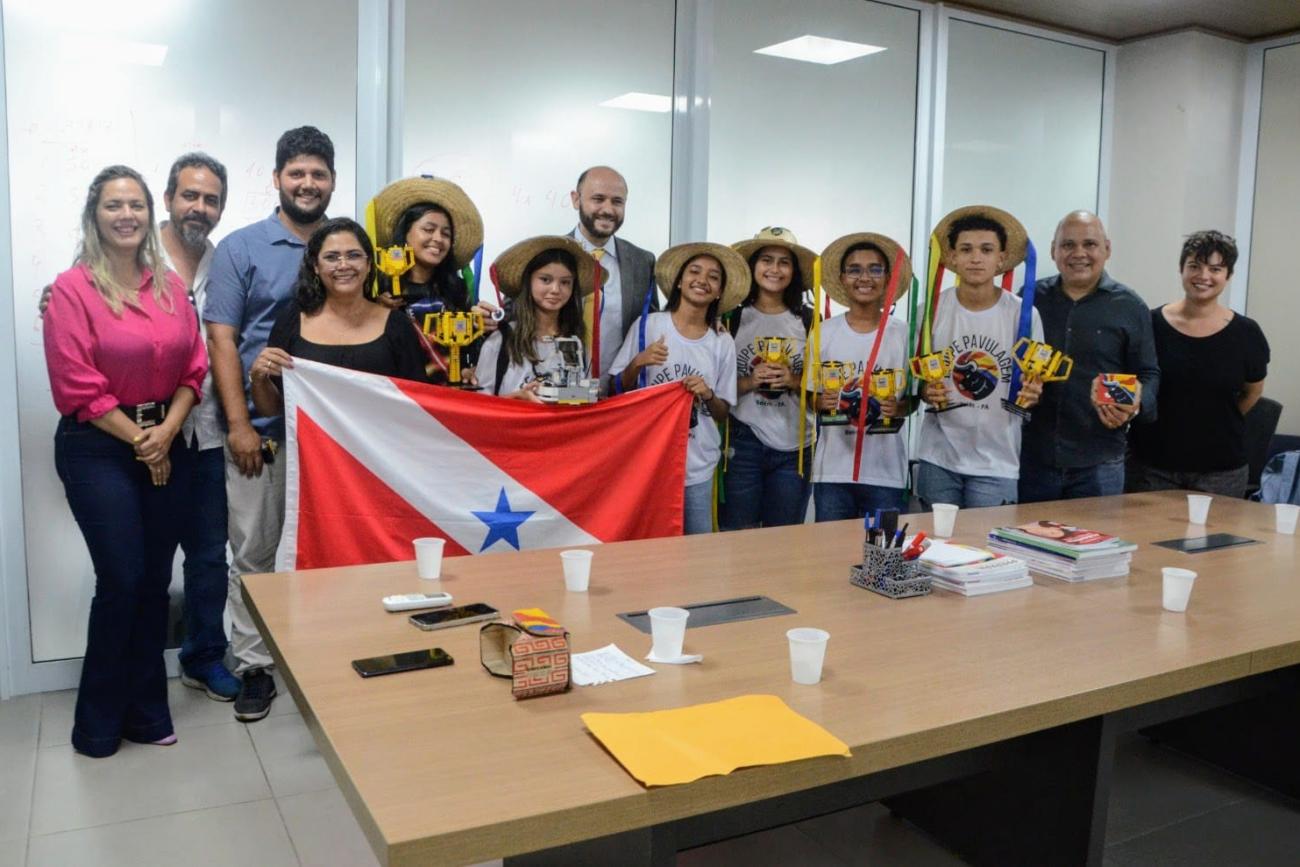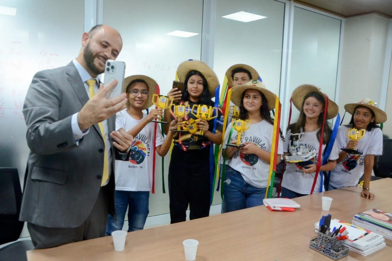 Os estudantes da rede estadual de ensino, que conquistaram o segundo lugar na etapa estadual do Torneio Sesi de Robótica - First Lego League Challeng e vão disputar a fase nacional da competição em Brasília no dia 28 de fevereiro, foram recebidos pelo secretário de Estado de Educação do Pará, Rossieli Soares, na sede da Seduc, na tarde desta terça-feira (6). Na ocasião, os estudantes puderam, inclusive, entoar o canto de garra para o governador Helder Barbalho por videochamada realizada pelo secretário.
