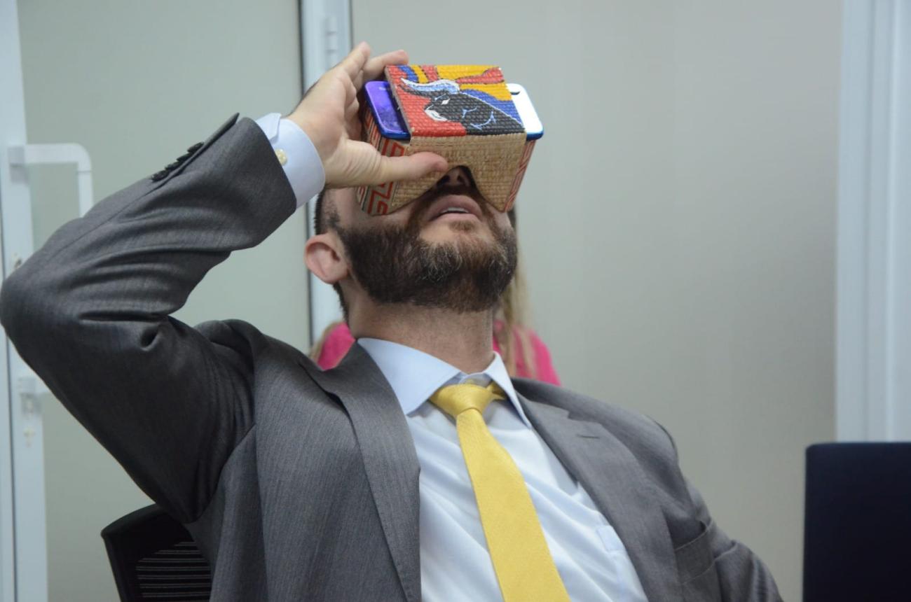 Secretário Rossieli Soares testando o ″Óculos VR de Miriti″ produzido pelos estudantesO Torneio Sesi de Robótica é um processo de aprendizagem colaborativa no qual estudantes e professores aprendem conteúdos de física, química, biologia, matemática e linguagens de forma instigante e divertida. A cada temporada, a modalidade desafia crianças e jovens de 9 a 15 anos a resolver problemas do dia a dia e os inspira a seguir carreira em áreas de tecnologia e inovação no futuro. Este ano, o tema central envolve a Arte e a Ciência.