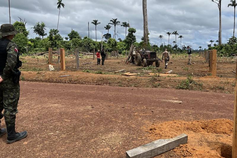 Durante a autuação realizada hoje, a qual faz parte das ações da Operação Curupira, foram identificadas 3 mil cabeças de gado e uma grande quantidade de estacas para construção de cerca. Um trator foi encontrado e inutilizado com o uso de fogo, com o auxílio do Corpo de Bombeiros.