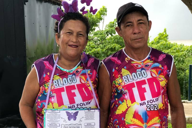 Entre os entusiasmados foliões estava a usuária do CIIR, Maria dos Reis, de 64 anos, que é atendida na instituição há quatro anos, enfatiza a sua satisfação na instituição após receber o diagnóstico de Ataxia Cerebelar.