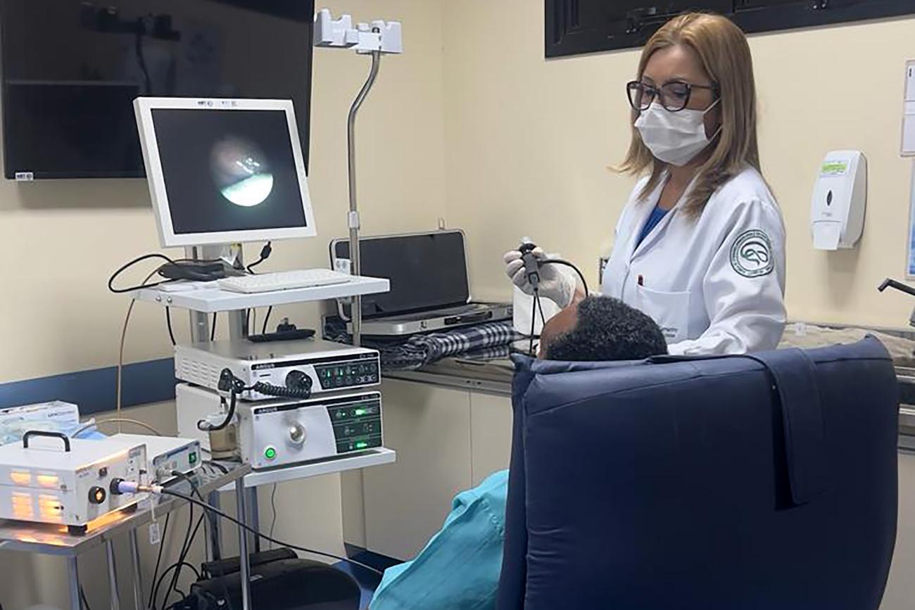 Médica realizando o procedimento, que permite a visualização de anomalias nas vias respiratórias e garganta