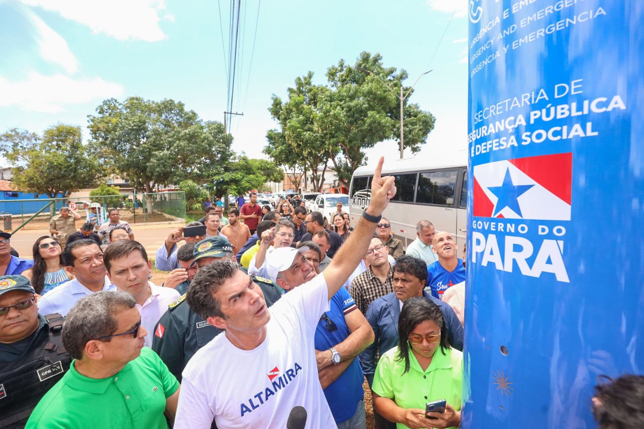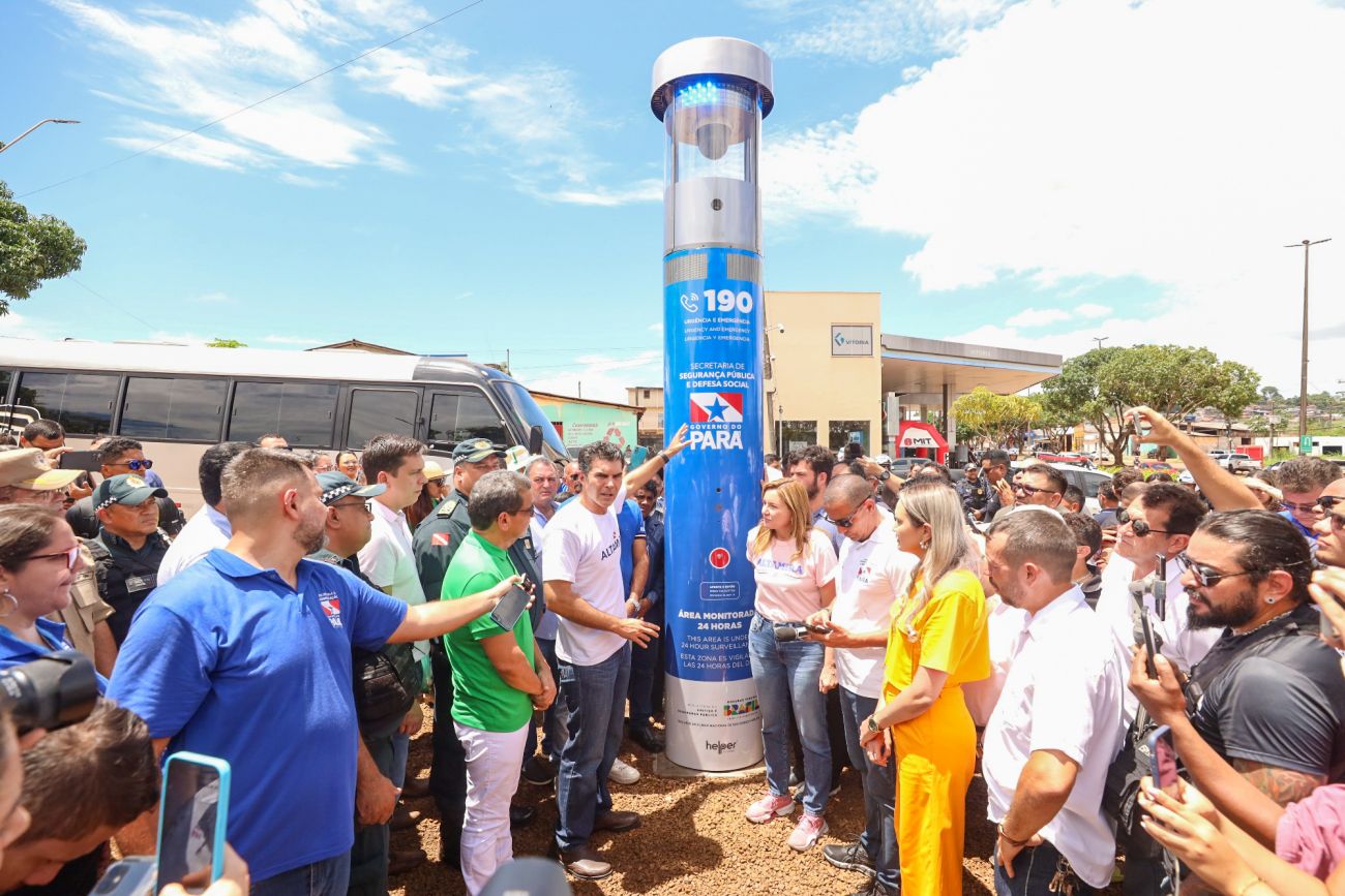 “São, portanto, cinco municípios que inicialmente estão recebendo estes totens. Aqui, são oito locais de Altamira que estão sendo contemplados. Este equipamento possui câmera 360º, além de outras câmeras que ficam permanentemente fazendo o monitoramento, [além de] inteligência artificial em que há, a partir do monitoramento de câmeras, a identificação facial e, caso a pessoa esteja no sistema de procura do sistema penal, imediatamente é acionado o Ciop para que seja feita a recaptura. Da mesma forma, também é integrado com o Departamento de Trânsito do Estado, para que se a placa estiver acusando ser um carro roubado, furtado ou que tenha qualquer tipo de pendências com a Justiça ou com o sistema de segurança, também é acionado o sistema de segurança. Aqui, o cidadão pode acionar a partir deste botão, diretamente, o 190 e fazer a solicitação, a demanda, o pedido de socorro ou pedido de apoio para o sistema do Ciop”, explicou Helder Barbalho.