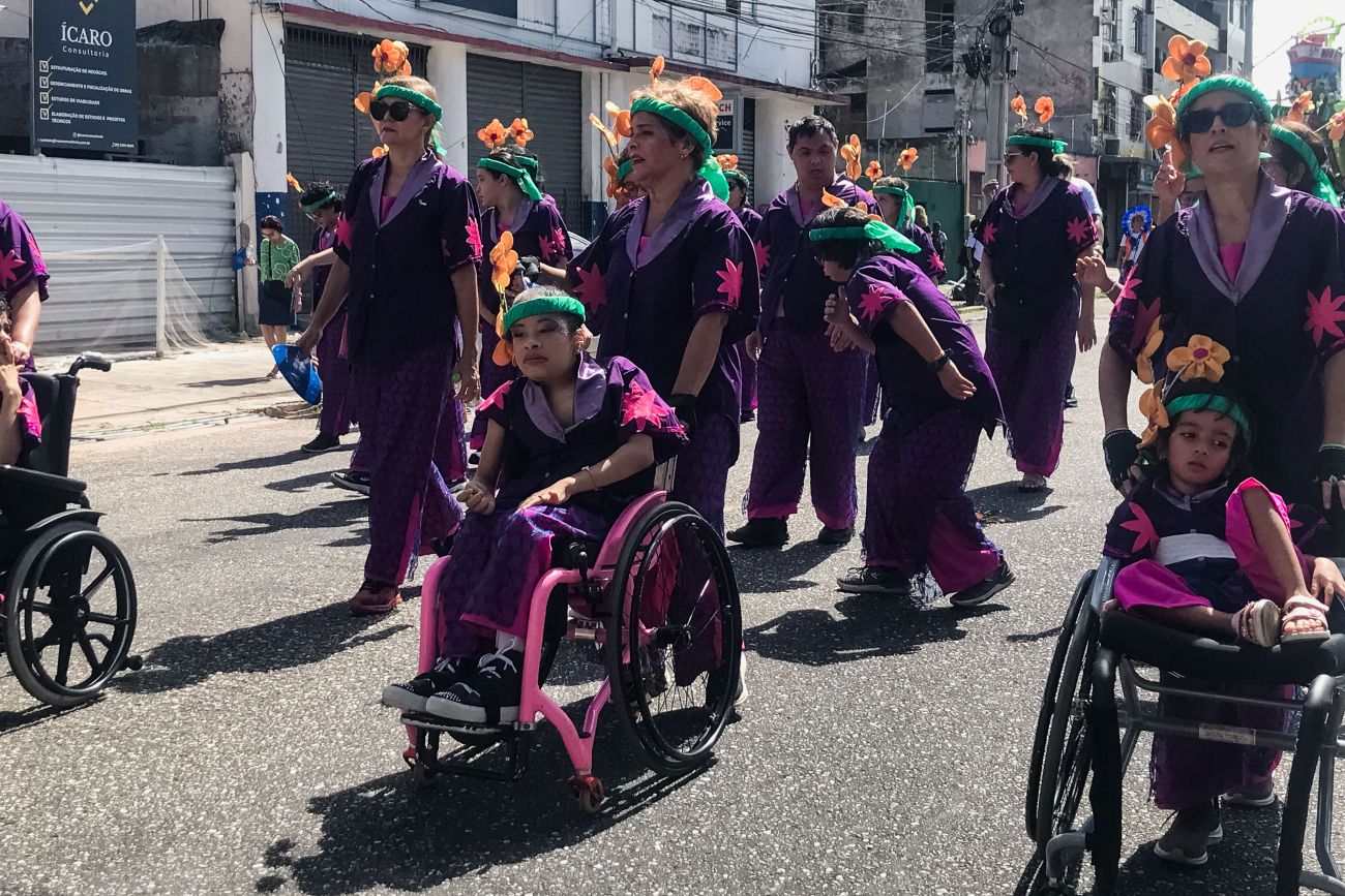 A cadeirante Débora Cardoso, desfilou pelo segundo ano consecutivo como porta-bandeira do Grêmio Recreativo Escola de Samba Crias do Curro Velho (GRES CCV). Representando a “Garça Namoradeira”, figura regional que ganhou destaque na música da cantora e compositora paraense Dona Onete, Débora festejou mais uma oportunidade de participar do projeto da FCP.