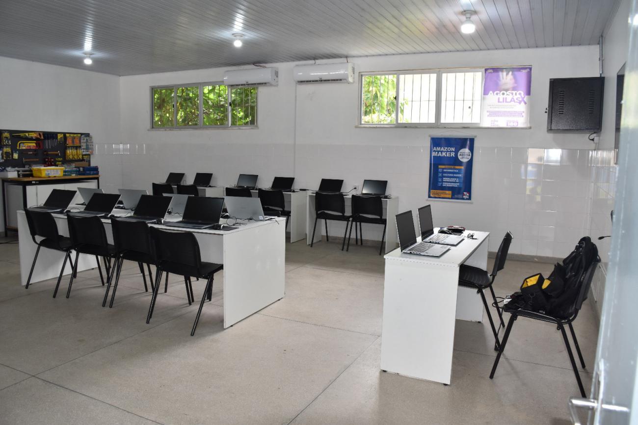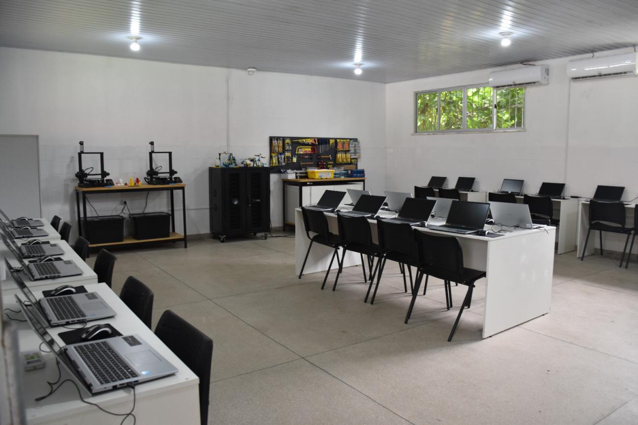 Desenvolvimento - O espaço dispõe de uma televisão 50 polegadas, quadro, duas impressoras 3D, 22 notebooks, 5 kits de robótica da lego, além de ferramentas e materiais para aprendizagem da cultura maker.