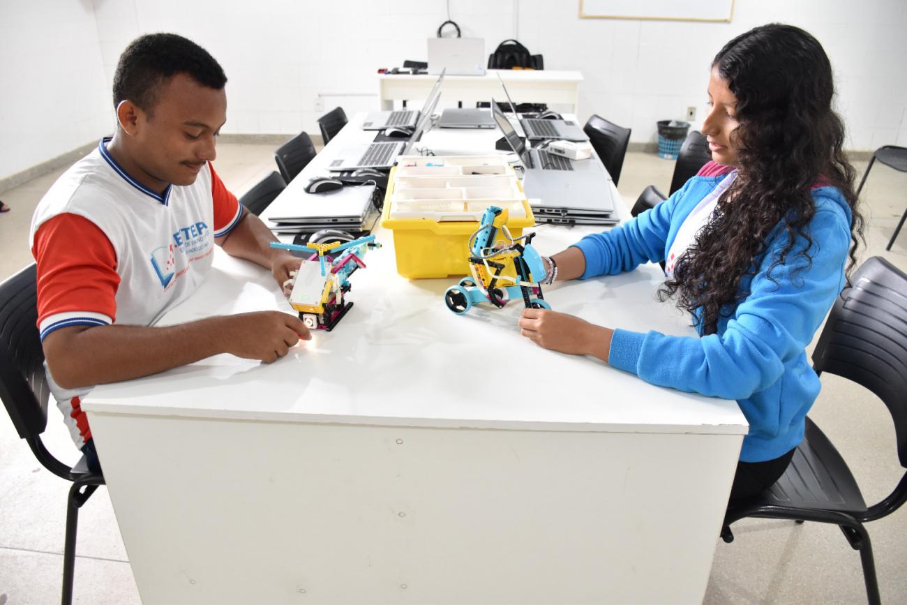 Danilo Coutinho e Any Portilho, alunos da EETEPA de Cametá, manuseiam peças dos kits de robótica disponíveis no laboratórioCoordenado pela Secretaria de Estado de Ciência, Tecnologia e Educação Superior, Profissional e Tecnológica (SECTET), a EETEPA de Cametá recebeu, na última quinta-feira (29), um novo laboratório maker.