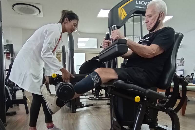 A profissional de Educação Física Samila Ribeiro está entre as 103 profissionais do Setor de Reabilitação. Ela conduz as atividades realizadas com Renato Borges, 74 anos, no processo de pré-protetização - para receber próteses em ambas as pernas, devido ao diabetes. Há cerca de sete meses ele contabiliza ganhos no desenvolvimento corporal, recuperando com força muscular e equilíbrio.