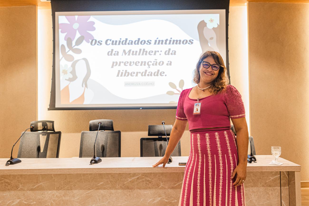 Fisioterapeuta Andrezza Coêlho: olhar diferenciadoOs “Cuidados Íntimos da Mulher: da prevenção à liberdade” foi o tema da palestra ministrada pela fisioterapeuta pélvica Andrezza Coêlho. Segundo a especialista, abordar os cuidados na região íntima é libertador, e ajuda a mulher a ter um olhar diferenciado para o próprio corpo. “Por muito tempo em nossas vidas, ou por uma questão religiosa ou de educação, não podíamos olhar, tocar nessa região, apenas pelo fato de sermos mulheres. Mas isso vem mudando ao longo do tempo em razão do empoderamento feminino. Falar sobre cuidados íntimos, conhecer a anatomia e aparência da região vaginal é importante para que esse conhecimento se transforme em saúde”, frisou a fisioterapeuta.