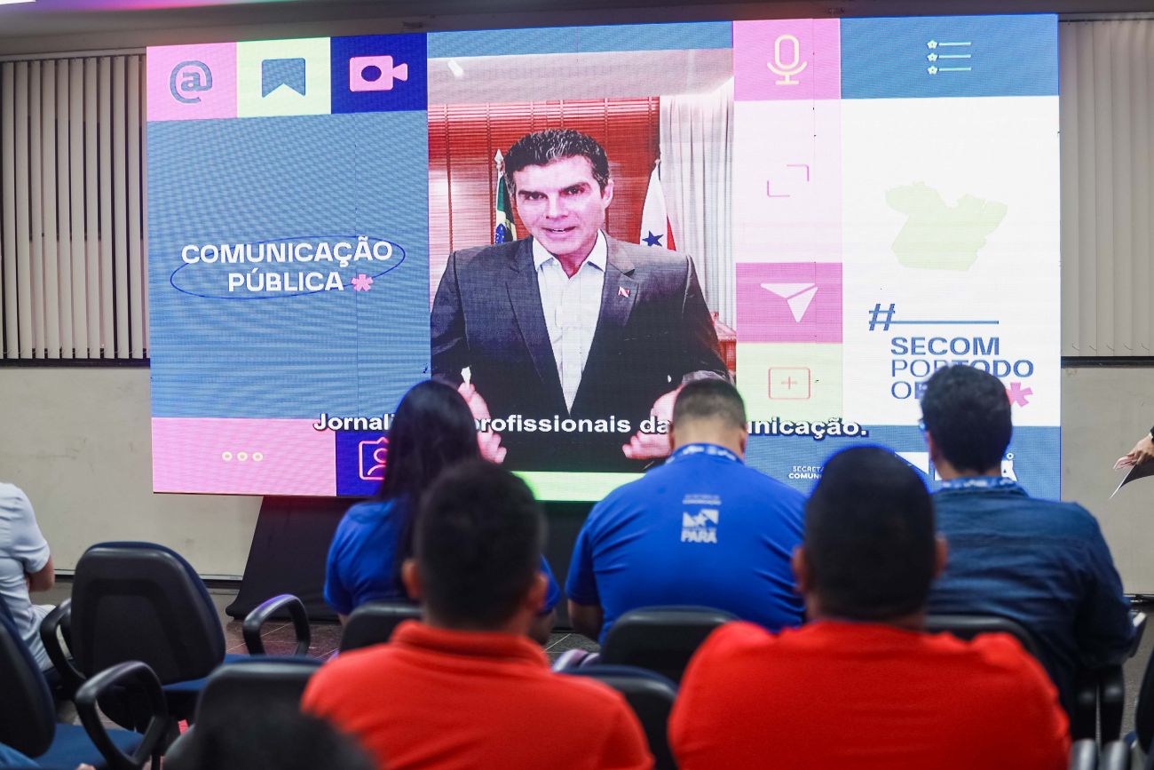 Por vídeo, o governador Helder Barbalho fez questão de cumprimentar os jornalistas presentes, e falou sobre as expectativas e desafios de comunicar na Amazônia, ainda mais às vésperas da realização da 30ª Conferência das Partes (COP 30) em Belém.