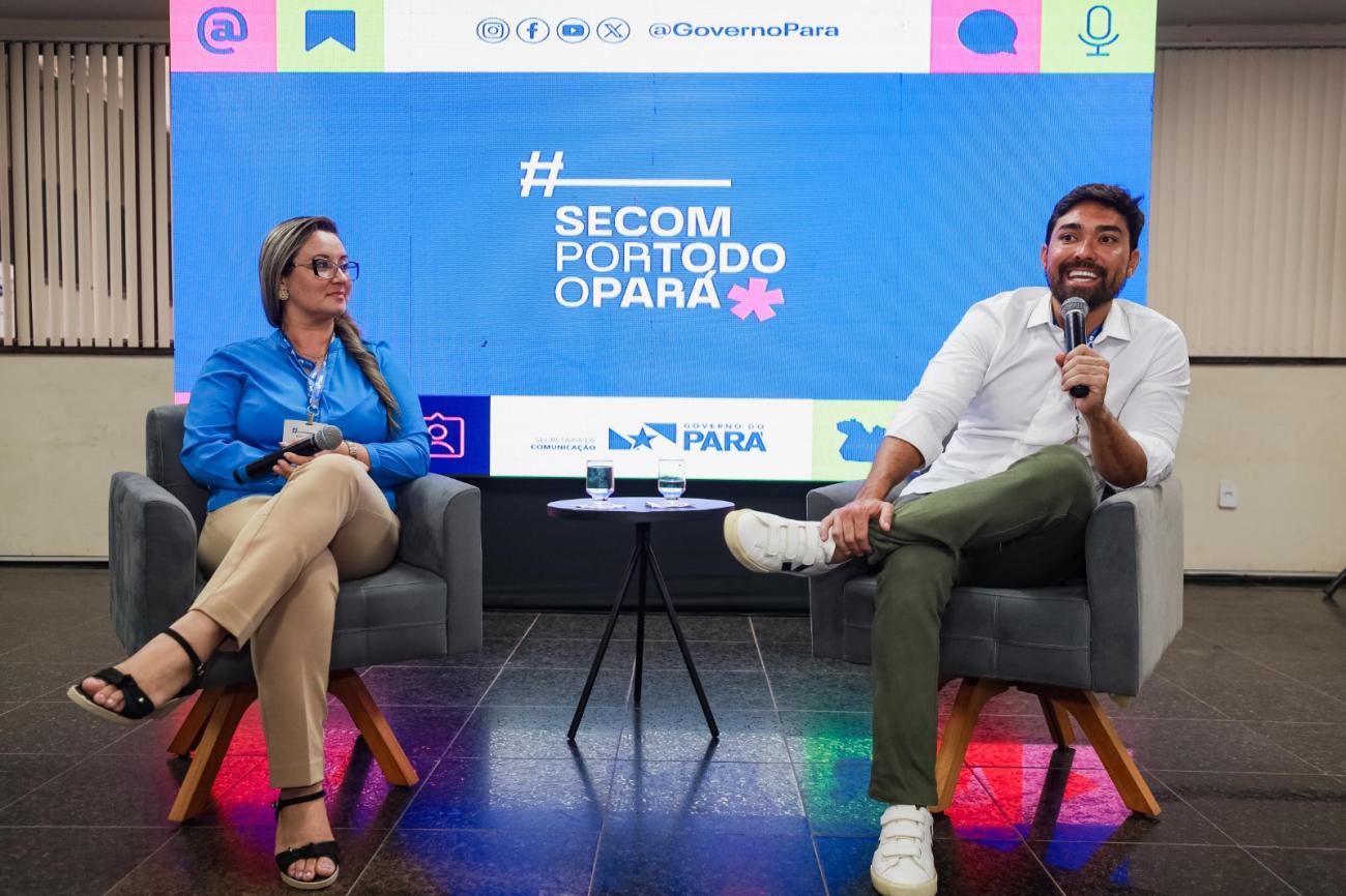 Os debatedores, Luciano Cuns, diretor de Jornalismo e Flávia Lima, diretora do Digital da Secretaria de Estado de Comunicação, participaram da palestra "Comunicação Pública na Amazônia".