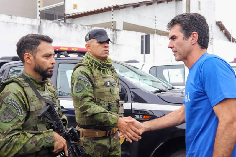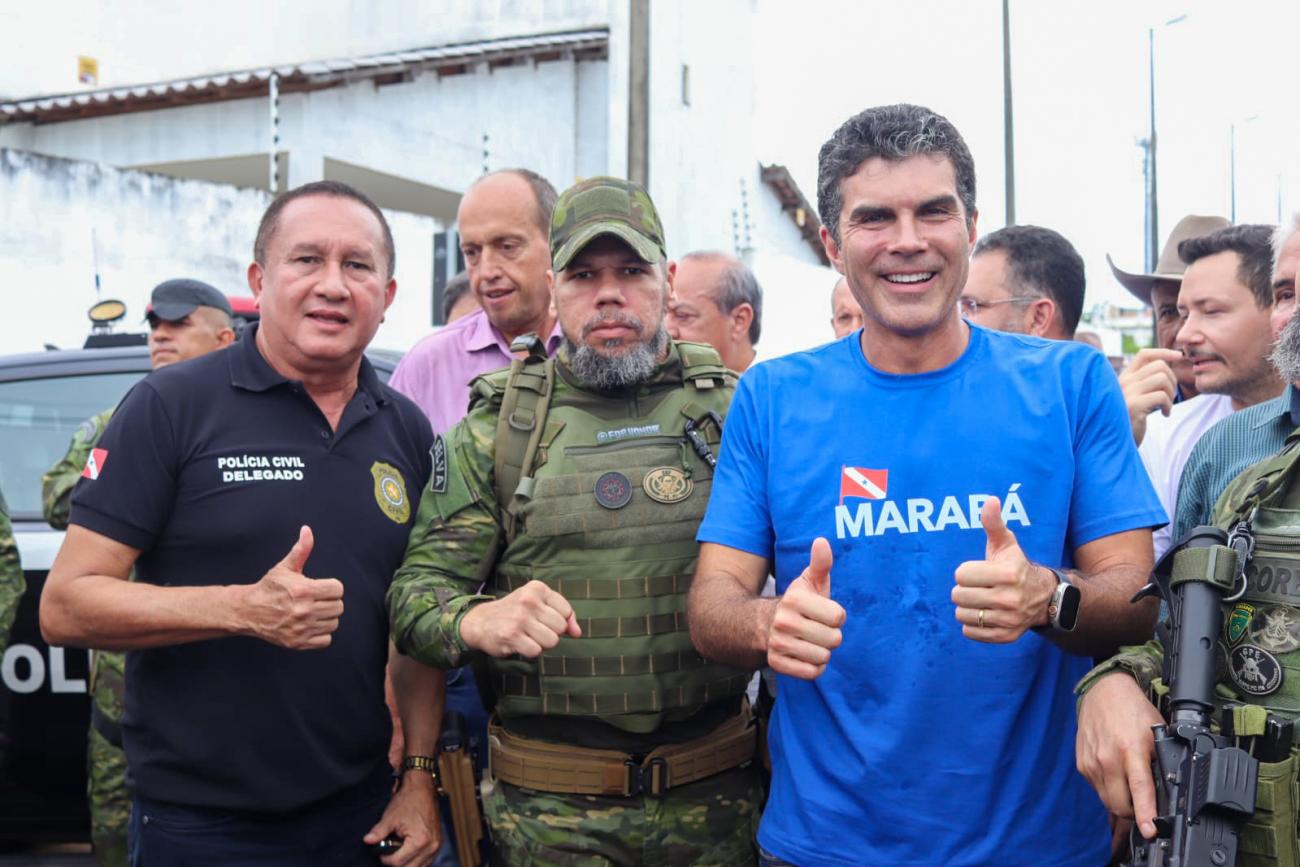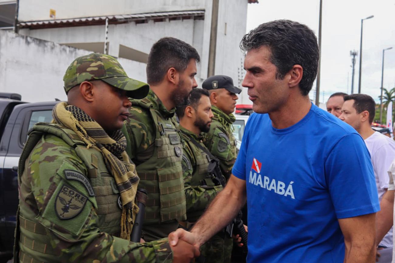 Governador Helder Barbalho, o delegado-geral da Polícia Civil, Walter Resende, e demais integrantes das forças de segurança
