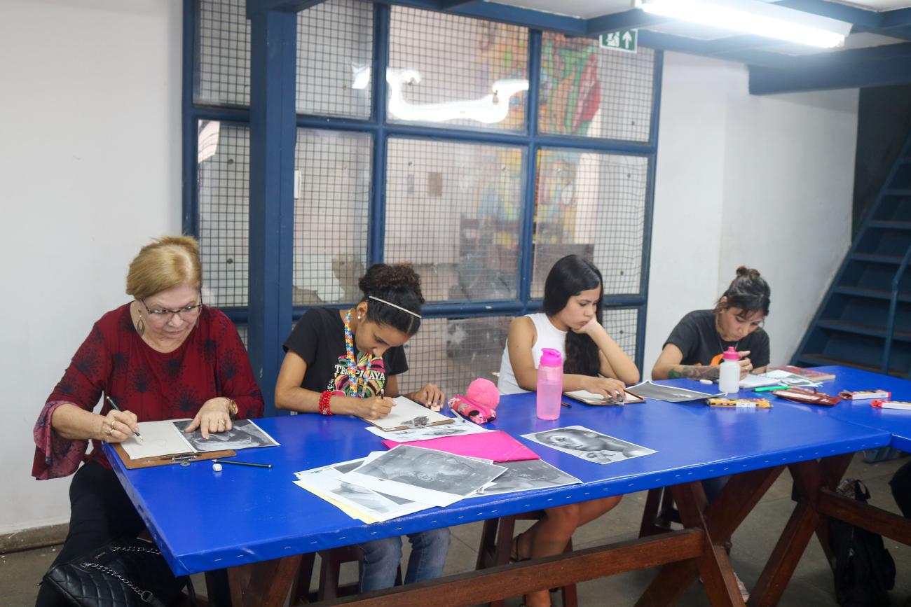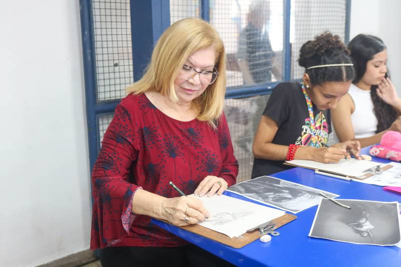 Uma das oficinas ofertadas no Curro Velho é a de Iniciação ao Desenho, que oferece aos alunos a primeira experiência na arte visual. De crianças a idosos, o curso já ganhou o carinho do público. Uma das alunas é a farmacêutica Nazaré Alencar, de 71 anos, que falou sobre a importância da atividade.
