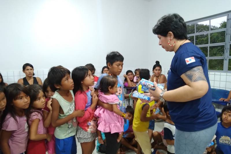 “Agora, com outras especialidades que a gente atrelou, fizemos essa parceria junto ao Hospital de Clínicas para trazer uma equipe multiprofissional. Então vieram psicólogos do HC, psiquiatras, assistentes sociais, terapeuta ocupacional, educador físico, uma equipe multiprofissional que já trabalha esse formato no HC para trazer para dentro dos nossos territórios indígenas e está sendo um sucesso”, afirmou Tatiany Peralta, Coordenadora da Saúde Indígena e Populações Tradicionais da SESPA.