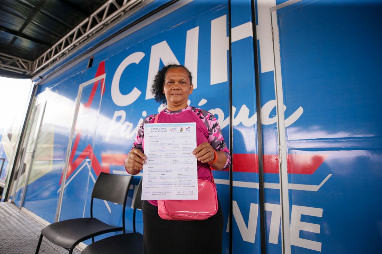 Autônoma Ângela Maria Santos exibe o cadastro que a inclui no Programa CNH PaiD'égua do Detran "É muito importante para mim ter esse documento e as condições financeiras não estão dando, a abertura desse programa é uma felicidade muito grande, é muito importante olhar para a comunidade nesse sentido" conta a também autônoma Ângela Maria Santos, de 54 anos, que também aproveitou a ação de hoje em Marituba.