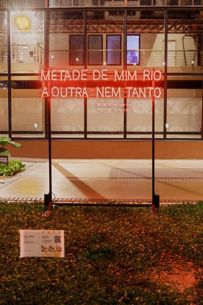 Com o projeto de intervenção pública “Metade de mim rio a outra nem tanto”, Keyla Sobral apresenta peça em neon de vidro, nas cores verde e vermelha, para áreas interna e externa, respectivamente, que propõem um diálogo entre a palavra e a paisagem. “É um transbordamento. É essa relação rio-floresta. Essa geografia-sentimento. Que palavras são essas? Um rio de metáforas”, diz Keyla.