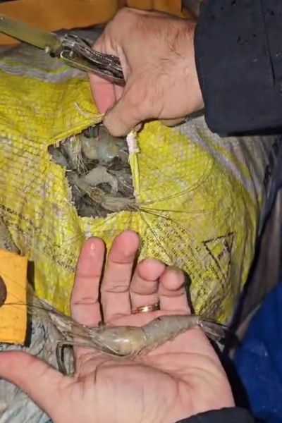 O produto estava acondicionado em sacasA carga de camarão cinza estava armazenada em 30 sacas, e era transportada sem refrigeração adequada, além de não apresentar documentação sanitária, que define o local de origem e destino, e atesta a qualidade do produto.