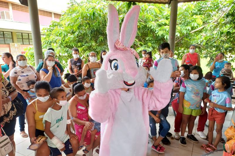 Cerca de 50 crianças participaram da festa de Páscoa do HRBA, que foi realizada na Maloca da unidade, todas pacientes que fazem tratamento no HRBA. A celebração foi possível graças a uma parceria com o projeto voluntário Amigos dos Anjos de Deus, que dá apoio aos pequenos em tratamento oncológico e de doenças crônicas e às famílias desses pacientes.