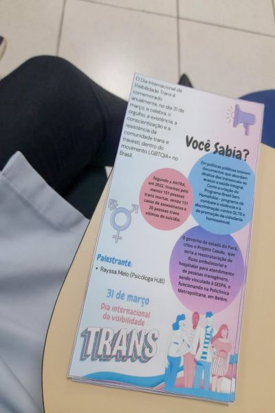 Em comemoração alusiva ao Dia Internacional da Visibilidade Transgênero, neste domingo, 31, a gestão do gestão do Hospital Jean Bitar (HJB), em Belém, por meio do Grupo de Trabalho de Humanização (GTH), promoveu nos dias 25 e 26, Roda de Conversa com os colaboradores da unidade para melhorar, cada vez mais, a assistência destes usuários, com a oferta de atendimento humanizado e inclusivo, tendo em vista que a unidade hospitalar é a única no Norte do Brasil credenciada para realização dos processos de Cirurgia Redesignação Sexual (CRS).