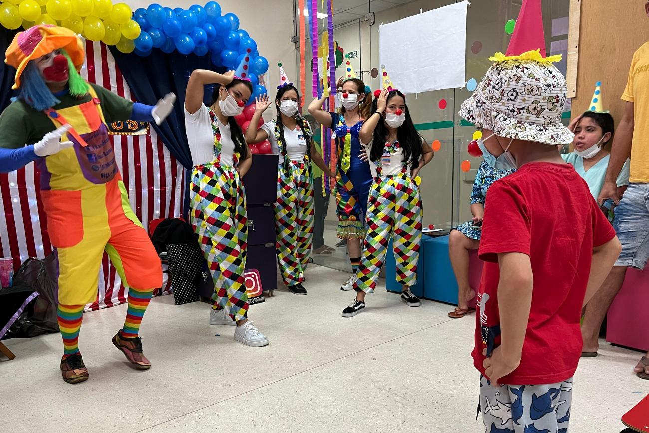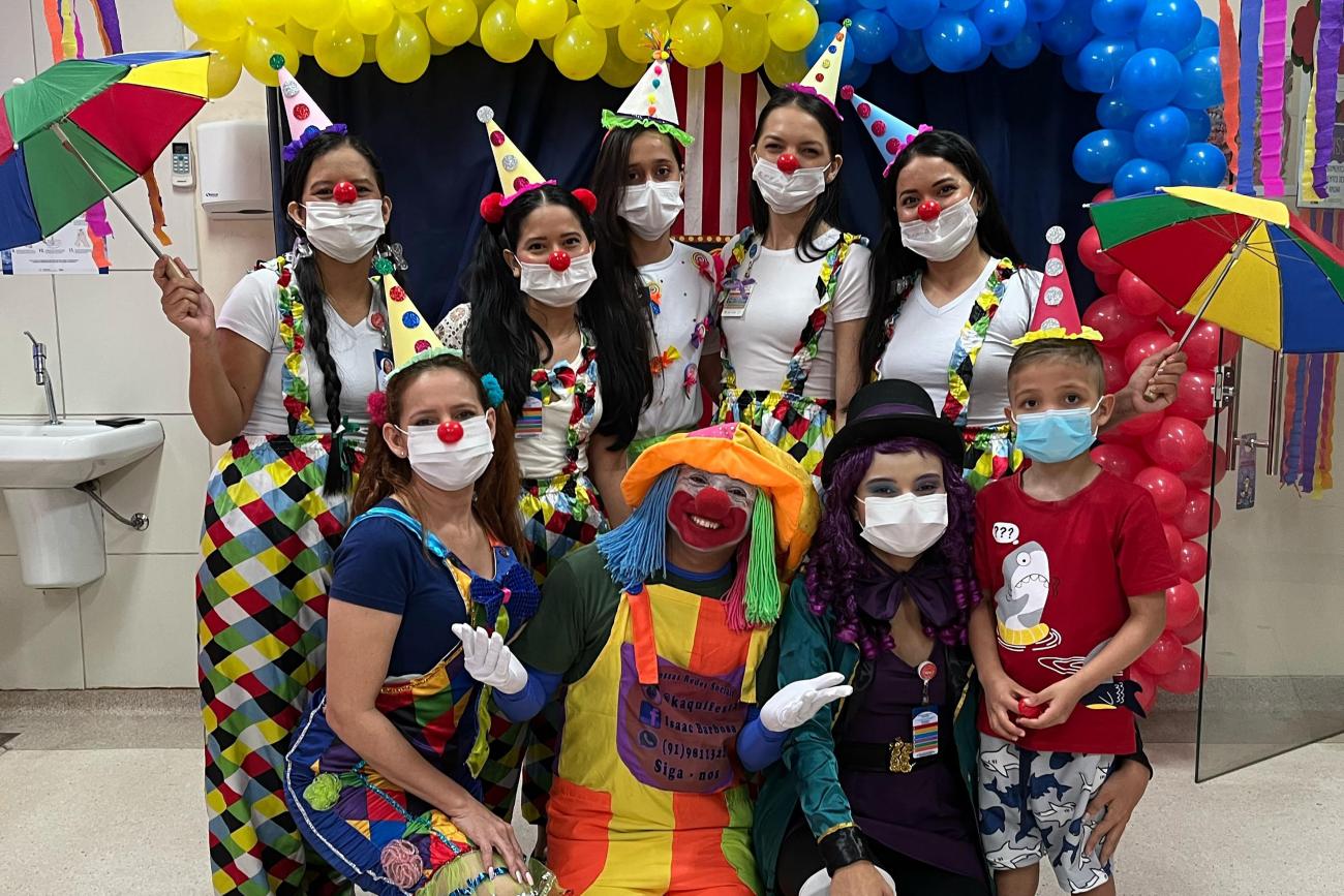 A equipe do Hospital Octávio Lobo se caracterizou de palhaço para tornar mais divertida a programação voltada às criançasCaracterizados de palhaços, os colaboradores ampliaram a magia criada com o cenário e promoveram maior interação do público com os artistas. Cada número apresentado foi recebido com aplausos entusiasmados dos usuários. Para a coordenadora de Humanização, Natacha Cardoso, uma pausa bem-vinda na jornada de enfrentamento ao câncer.