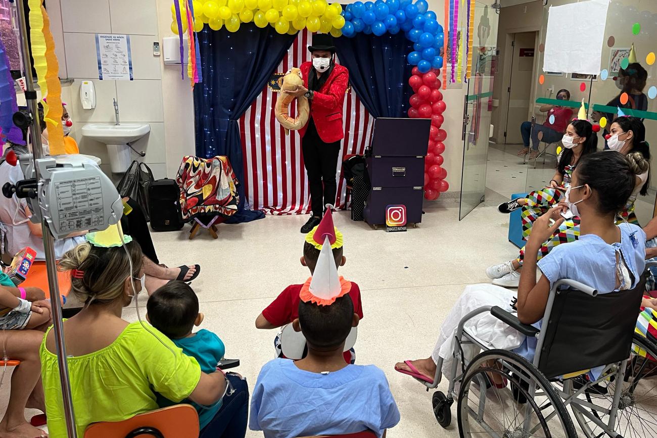 Mágico e palhaços ajudam a descontrair pacientes de câncer do Hospital Octávio Lobo