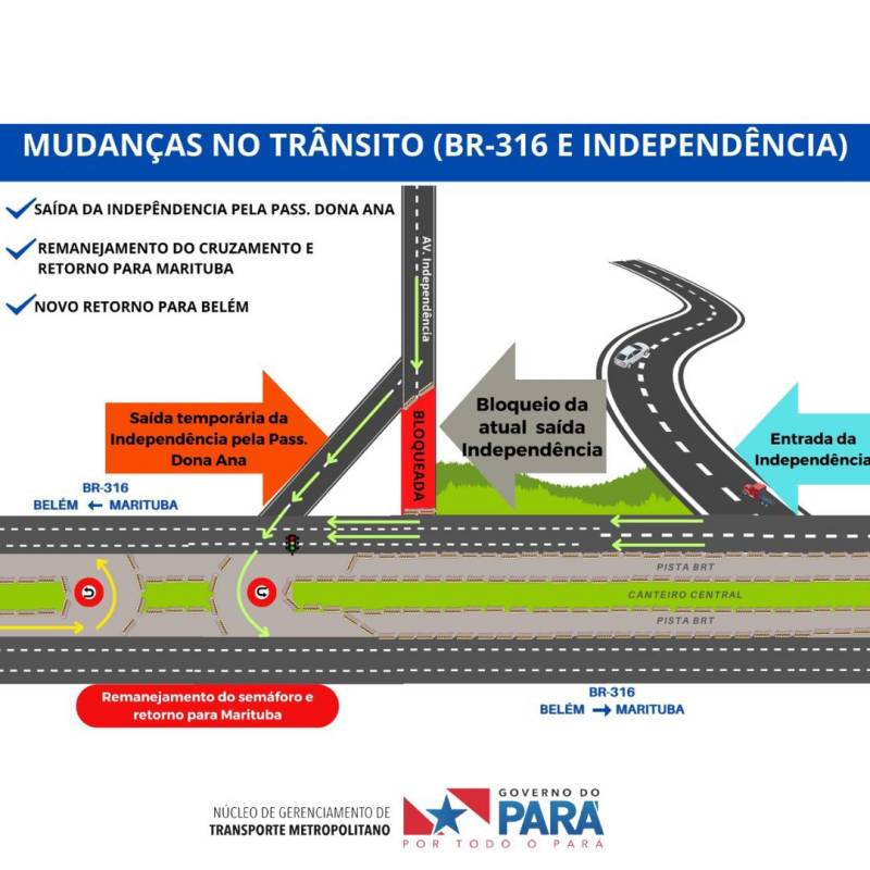 Para a execução deste serviço, serão necessárias mudanças na saída da Av. Independência. A atual saída da avenida para a BR-316 será temporariamente bloqueada e o tráfego será desviado para a Passagem Dona Ana (rua ao lado da atual saída). Na BR-316, o retorno e cruzamento para Marituba serão remanejados, retirando o sinal.