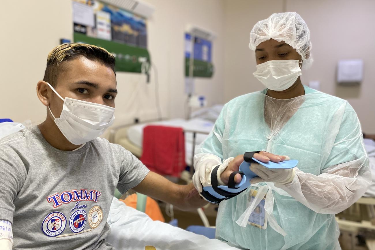 Adenil Vulcão, de 27 anos, chegou ao Baixo Tocantins após sofrer um acidente elétrico. Ele está internado há mais de dois meses no Centro de Tratamento de Queimados (CTQ) do Metropolitano há dois meses. Dada a gravidade do trauma, o rapaz precisou amputar um dos membros superiores para continuar o tratamento. Foi criado um dispositivo que lhe permitiu ter autonomia para se alimentar sozinho ou usar o celular.
