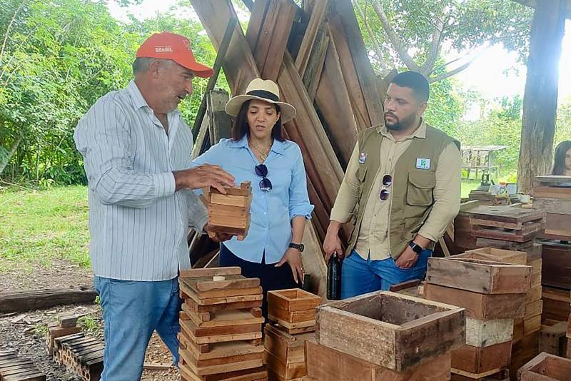 Incentivo - O Projeto Amabee, responsável pelo manejo de abelhas sem ferrão que produzem mel natural e livre de agrotóxicos, também recebeu a visita da comitiva. Essa atividade, apoiada pelo Ideflor-Bio, através da GRTUC, representa um exemplo de como a parceria entre órgãos governamentais e iniciativas locais pode promover a manutenção da biodiversidade de forma sustentável.
