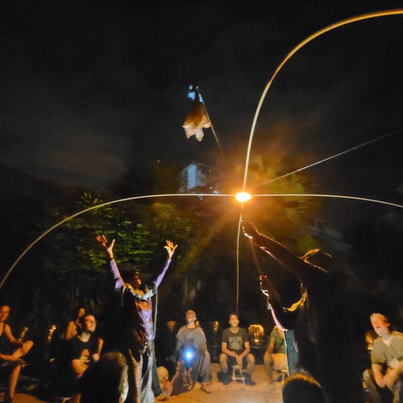 "Aguar o Tempo" é conduzido por quatro atores dentro da roda: Adriana Cruz, Anibal Pacha, Cincinato Jr e Paulo Ricardo Nascimento, e uma em torno: Cris Costa. Cada um traz depoimentos para narrar aos participantes, movidos pelo desejo de compreender acontecimentos no território-tempo, sobre os seres que o habitam e caminham no passado e no futuro. O espetáculo é a última criação do grupo e promove uma atmosfera de encontro com as ancestralidades ali presentes, em cena, e toda a ancestralidade do grupo. "Onde é possível identificar, através das sequências de histórias e da forma como essas histórias estão sendo contadas. Como o boneco ou o objeto, às vezes, assume uma função dramatúrgica dentro da encenação. Então, ele é a criação de uma roda imaginária onde sequências de histórias vão sendo contadas", descreve Cristina.