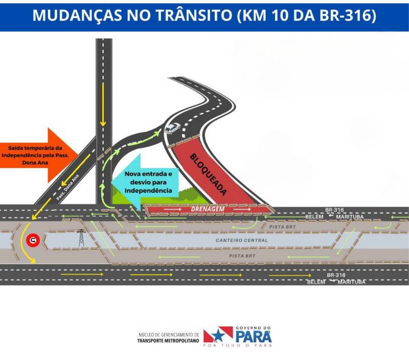 Para o início das obras, na semana passada foi bloqueado o trecho de saída da avenida Independência para a BR-316. O fluxo de veículos foi desviado para a passagem Dona Ana. O semáforo e o retorno que existiam em frente a avenida Independência foram remanejados pelo Departamento de Trânsito do Pará (Detran-PA), que orienta os condutores.