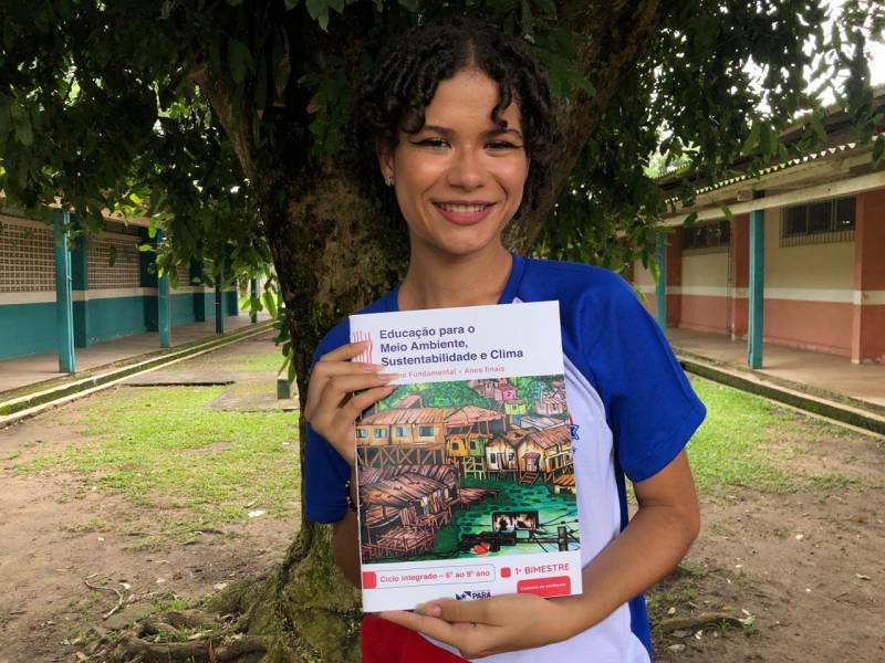 A estudante Luma de Fátima, da 2ª série do Ensino Médio da Escola Estadual Maria Antonieta Serra Freire, no distrito de Icoaraci, que teve seu desenho ilustrando a capa do livro de Educação Ambiental, Sustentabilidade e Clima para o Ensino Fundamental (anos finais), revela como recebeu a notícia da aprovação no concurso. “Eu fiquei muito surpresa, não imaginava ter um desenho meu na capa de um livro. Eu participei só para ver o que daria, mas não me imaginava ganhando. Quando soube fiquei sem chão e muito feliz”, contou Luma. A estudante tem o desenho como um passatempo desde criança e estimula a participação dos colegas no concurso. “Esse desenho começou como um trabalho e deu certo. Acredito que todos devam participar, é muito bom ver nossa arte na capa de um livro”, afirmou.