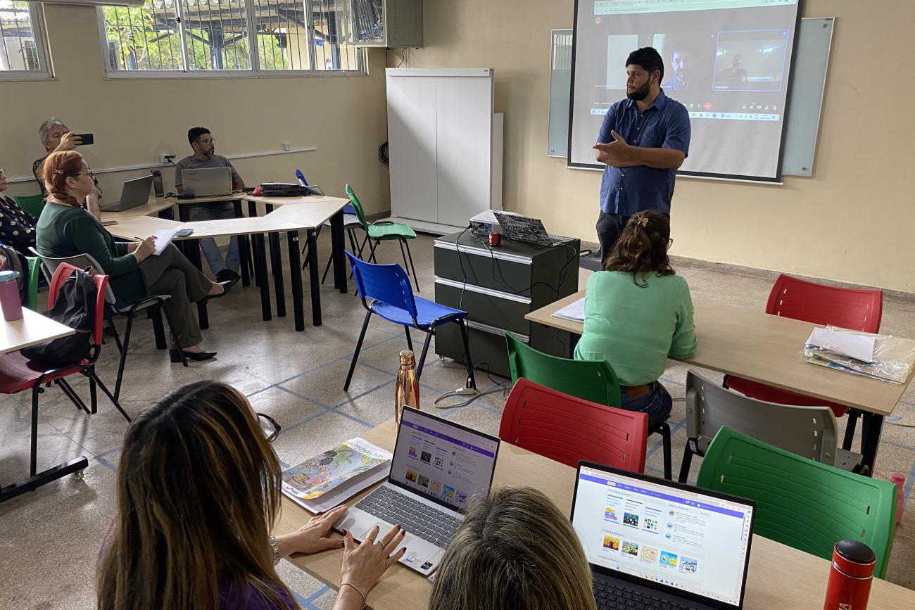 Durante o encontro, os professores puderam ter um bate-papo com o especialista em Computação Criativa na Rede Brasileira de Aprendizagem Criativa, João Adriano Freitas, o qual mostrou o passo a passo sobre o programa e como utilizá-lo na prática.