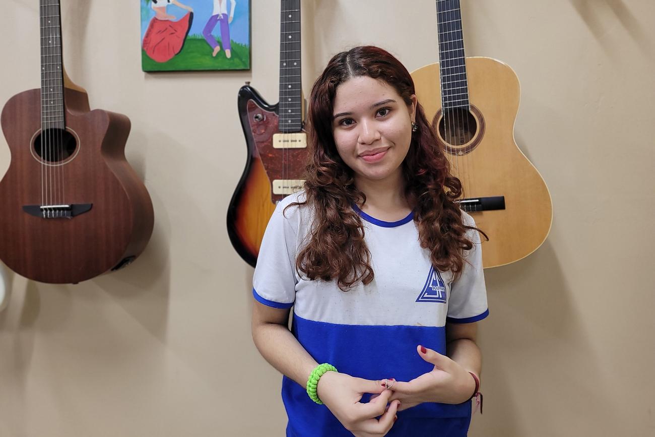 “Tive a experiência de participar de uma apresentação da Banda Vibe no Hangar, no evento do MEC, o Pé de Meia, e foi uma experiência nova para mim porque eu nunca tinha me apresentado para ninguém e foi o máximo. A gente se preparou, ensaiou e foi incrível”, relatou a estudante da 1ª série do Ensino Médio, Victória Wanzeller, que vê o Clube de Música como uma grande oportunidade.
