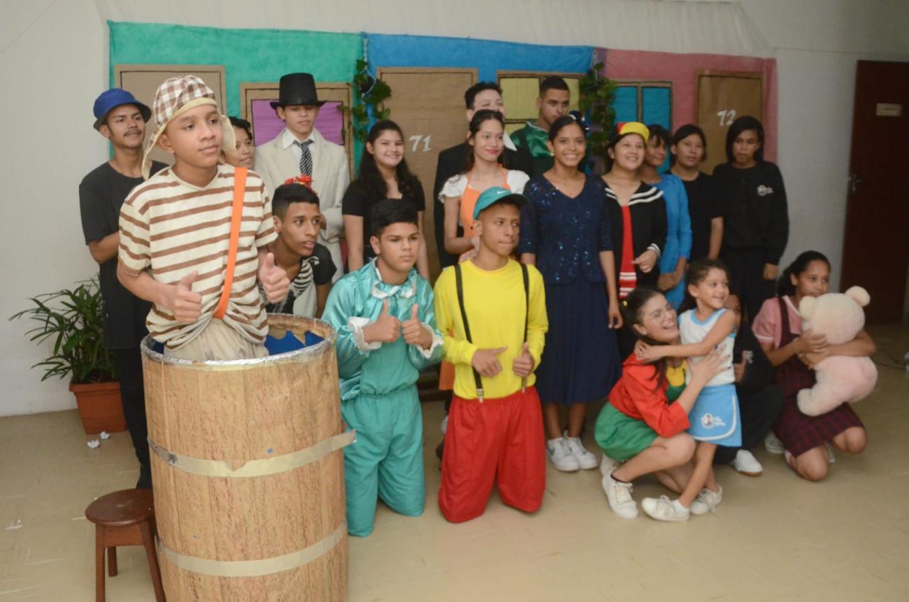 Professora de arte responsável pelo projeto, Lourdes Guedes escolhida e desenvolvida pelos próprios estudantes dentro da sala de aula. “A gente pensou em tudo. Eu chamei eles e a gente falou ‘bora começar a organizar o nosso roteiro’. Tudo é conversado na sala de aula e a opinião deles é o que traz o conteúdo. E nessas conversas eles citaram o Chaves e começaram a me falar e mostrar o que os personagens faziam e a gente então escolheu o tema. Pelo interesse do aluno é que a gente constrói o conteúdo também. Depois disso nós fomos atrás de ver os episódios, estudar vocabulário, criar o texto. E aí foi feito, eles trouxeram o que sabiam do Chaves, da televisão e escreveram. Eles fizeram a parte escrita, construímos o texto dramático juntos, cada um escreveu uma frase, daí a gente foi montando as cenas e foi um trabalho de um semestre todo”, explicou.