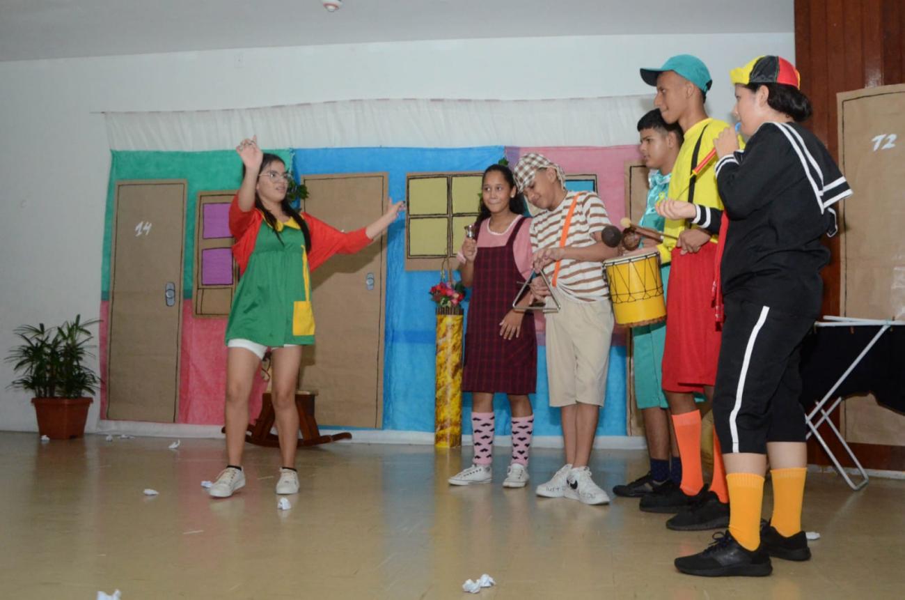 Com direito a um cenário elaborado, plateia e muita animação, os estudantes do 8° e 9° ano encenaram a peça "AbSurdos na Vila do Chaves", que recriou cenas marcantes do seriado de TV. "Eu adoro participar, eu fico muito emocionada, é muito bom. A professora Lurdes nos ensinou, eu fui aprendendo e apresentei. Isso é muito emocionante, eu me sinto muito bem. Eu adoro fazer a Chiquinha. A gente arrumou as coisas para a peça, estudamos o texto, anotamos várias coisas que precisávamos até porque a gente já via na televisão o Chaves. Eu acredito que posso ser inspiração para outras pessoas surdas, a pessoas são livres e, por exemplo, se me observar e se tiver vontade de atuar também podem fazer", contou a estudante do 8° ano, Mariana dos Santos, que interpretou a personagem Chiquinha.