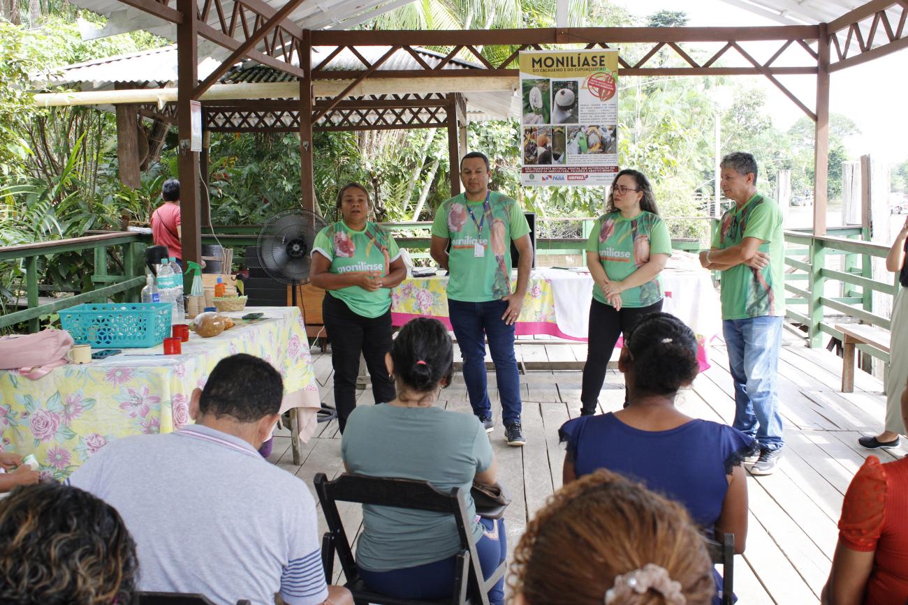 Fiscais agropecuários com Dona Nena, empreendedora da Ilha do Combu.Durante a roda de conversa, os fiscais estaduais agropecuários, engenheiros agrônomos Gabriela Cunha, Alexandre Mendes, Marluce Bronze e Euclides Holanda, que integram as Gerências de Educação Sanitária e do Programa do Cacau da Agência de Defesa, abordaram os sinais e sintomas da monilíase e as medidas de biossegurança que os produtores devem seguir para evitar a introdução da praga no território paraense.