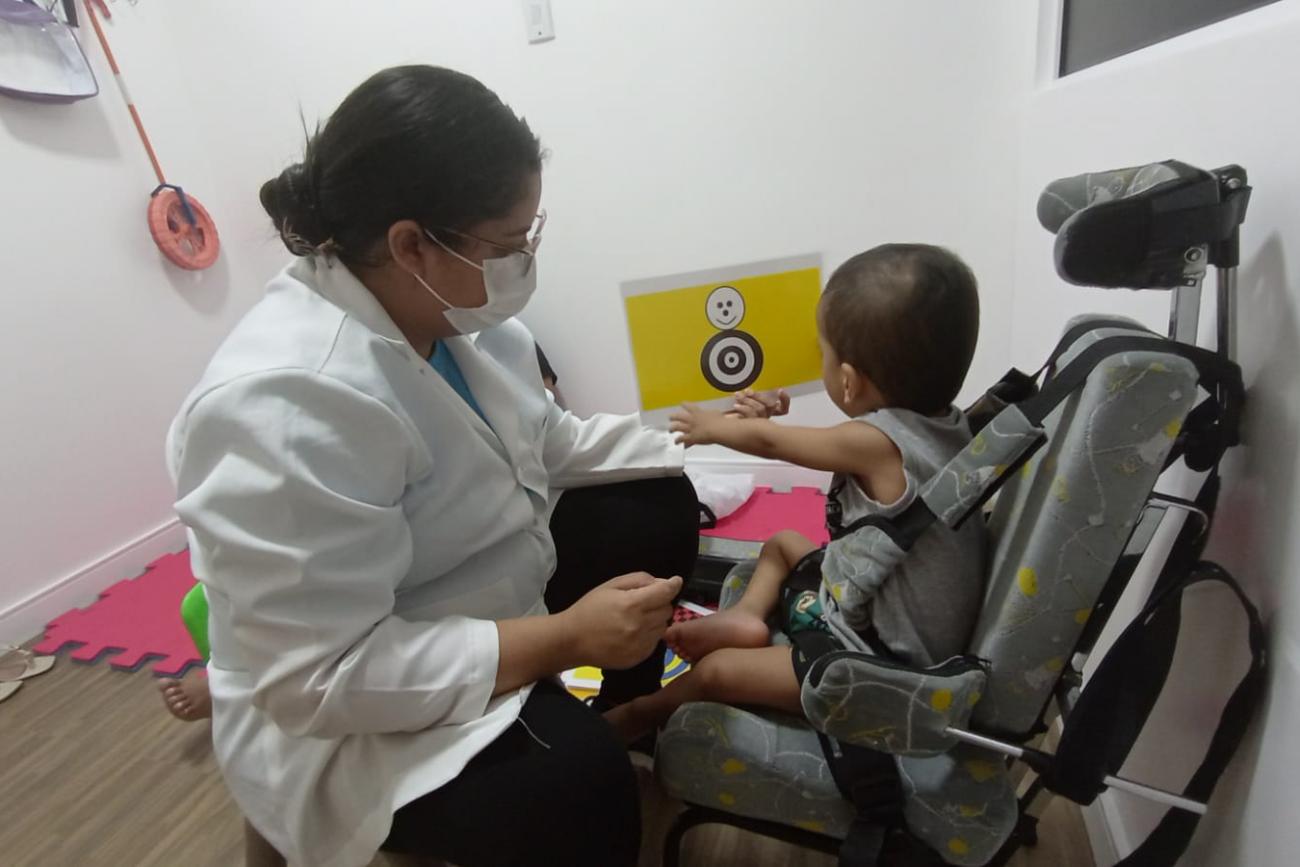 Para iniciar a conquista de desenvolvimento, Nina Silva, terapeuta ocupacional que conduz as atividades ao menino, aponta que atualmente está estimulando a fixação e o segmento visual, que utiliza, geralmente, recurso com contraste e/ou com luminosidade que é para o reabilitando responder em diferentes níveis de luminosidade.