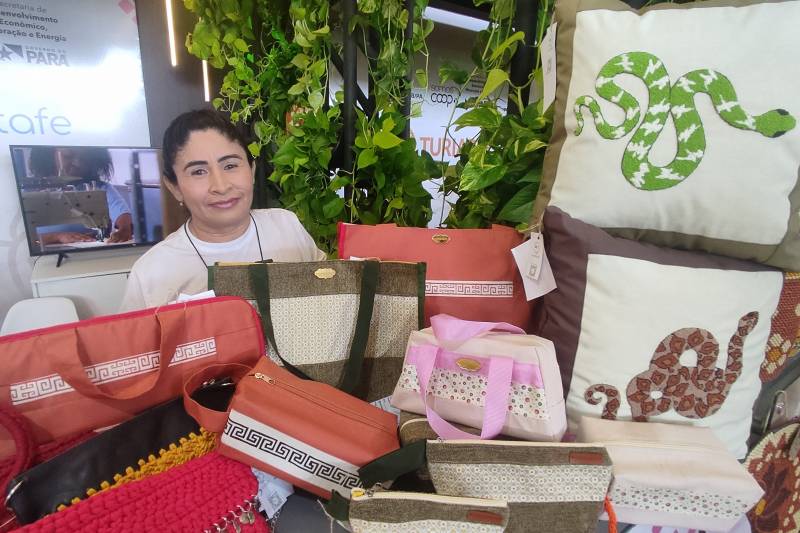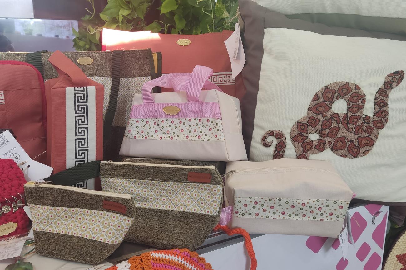 Peças artesanais como bolsas e almofadas bordadas foram apresentadas pela Cooperativa Social de Trabalho Arte Feminina Empreendedora (Coostafe)