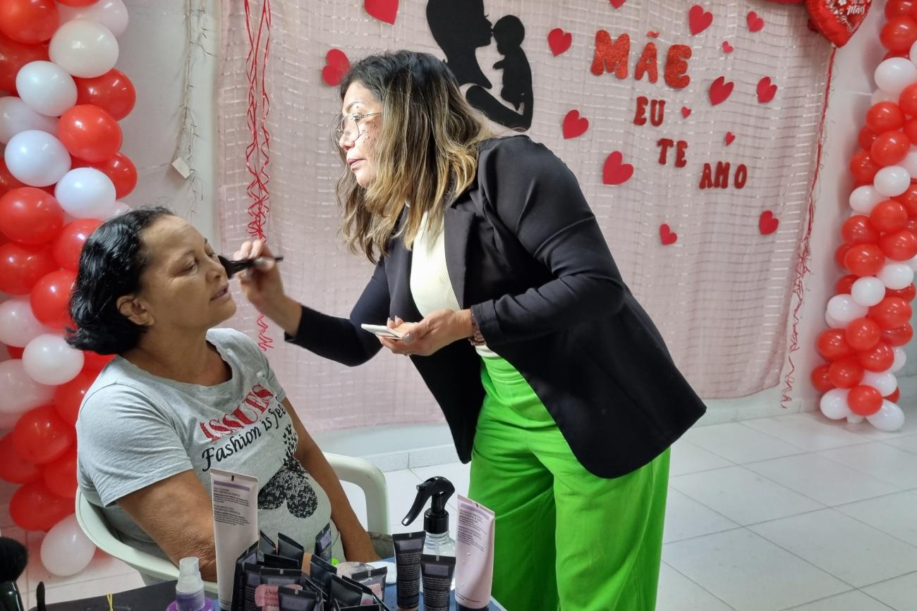 Rose Brabo foi voluntária maquiando as mãesA programação acontece nesta quarta (08), e quinta-feira (09), na Casa da Gestante da Santa Casa. Entre os cuidados oferecidos estão a massagem, limpeza de pele, maquiagem e atividades como oficinas, palestras, sessão de fotos, sorteio de brindes e uma apresentação da cantora Duda Dantas.