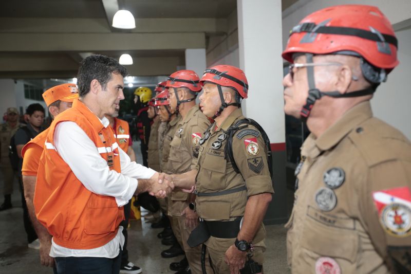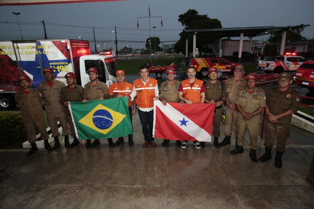 Governador Helder Barbalho, autoridades das forças de segurança e militares do Corpo de BombeirosDiante da urgente demanda por água potável e auxílio às buscas a vítimas das enchentes no Rio Grande do Sul, o governador Helder Barbalho anunciou nesta quinta-feira (09) o envio de 6 mil litros de água, produzida na Estação de Tratamento do Complexo Bolonha, da Companhia de Saneamento do Pará (Cosanpa), em Belém, além de nove militares, sendo sete especialistas em mergulho, do Grupamento de Busca e Salvamento do Corpo de Bombeiros Militar do Pará.