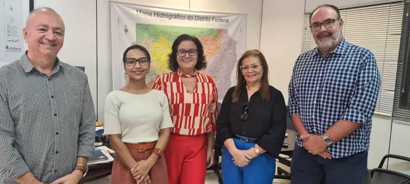 As analistas em Regulação Rosimar Borges e Valeria Fontelles, da Coordenadoria Técnica de Saneamento, foram recebidas pelo diretor da Adasa, Apolinário Rebelo, pelo Ouvidor Robson Cardoso e pela Superintendente da área de resíduos sólidos Elen Dânias dos Santos.