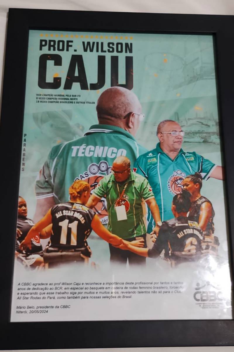 Nesta terça-feira (21), um dos técnicos beneficiados pelo programa Bolsa Talento do Governo do Estado do Pará, por meio da Secretaria de Estado e Lazer (Seel), Wilson Flávio da Silva Corrêa, mais conhecido como “Wilson Caju”, do Clube dos Deficientes - All Star Rodas foi homenageado pela Confederação Brasileira de Basquetebol em Cadeiras de Rodas (CBBC), com um quadro em alusão às suas conquistas e serviços prestados ao basquete brasileiro em cadeiras de rodas. A homenagem não parou por aí, a CBBC lançou o Troféu Itinerante com o nome do técnico.
