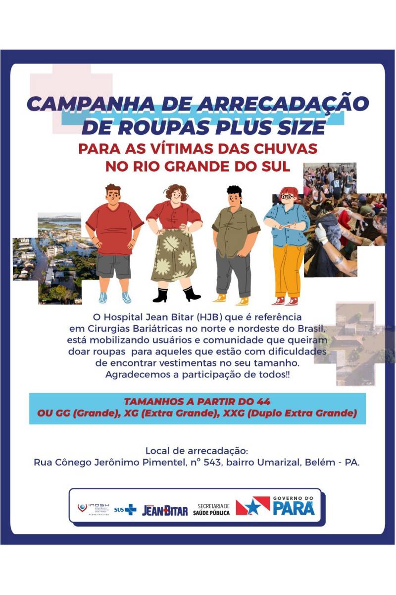 A gestão do Hospital Jean Bitar (HJB), em Belém, é referência estadual no tratamento da obesidade, com a realização de cirurgia bariátrica e outros tratamentos. E devido às enchentes que aconteceram no Rio Grande do Sul, milhares de pessoas precisaram deixar tudo para trás, incluindo suas roupas que foram perdidas em meio ao desastre natural. Entre essas vítimas, estão pessoas obesas, que em meio a tantas doações vindas de todo o Brasil, estão encontrando dificuldades para conseguir roupas no seu tamanho diferenciado.