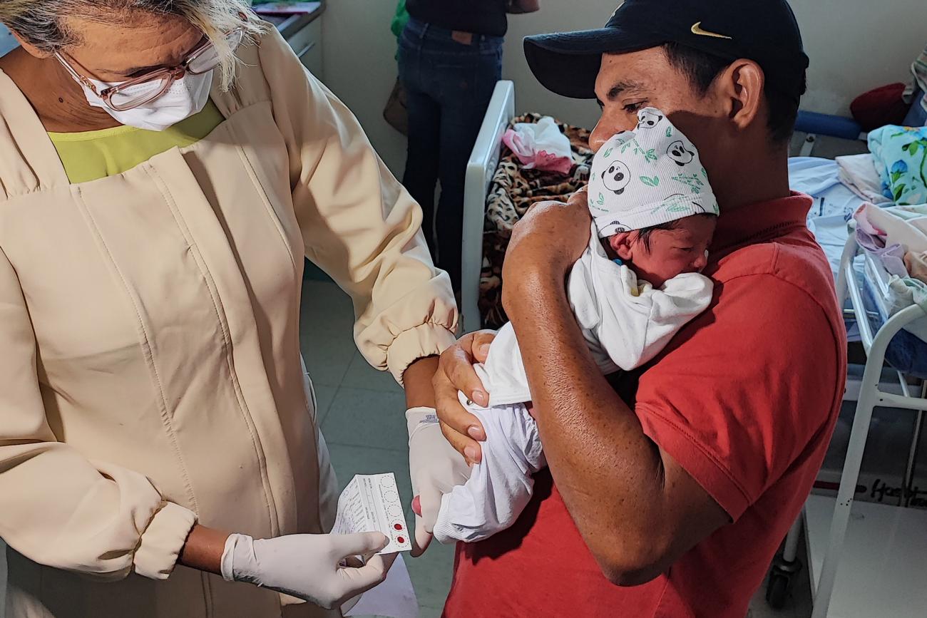Jonatas passa pela coleta no colo do paiO filho de Ivonete Moraes, o pequeno Jonata Gabriel nasceu na Santa Casa, porém, por questões de saúde da mãe, não pode receber alta logo nas primeiras 48 horas após o parto, com isso a criança realizou o teste do pezinho enquanto ainda estava internado na maternidade.